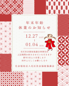 新着情報 NEWS 年末年始休業のご案内 平素は格別のご愛顧を賜り、厚く御礼申し上げます。 誠に勝手ながら、北社協では下記の期間を年末年始休業とさせていただきます。 ■年内最終営業日 2025年12月26日(金) 17時15分まで ■年末年始休業期間 2025年12月27日(土)~2026年1月4日(日) ■営業開始日 2026年1月5日(月) 8時30分より通常営業 休業期間中にいただいたお問い合わせにつきましては、2026年1月5日(月)以降、順次ご連絡させていただきます。 皆様には大変ご不便をおかけいたしますが、何卒ご理解のほどお願い申し上げます。 一覧へ戻る トップページ トピック & NEWS 年末年始休業のご案内 page top